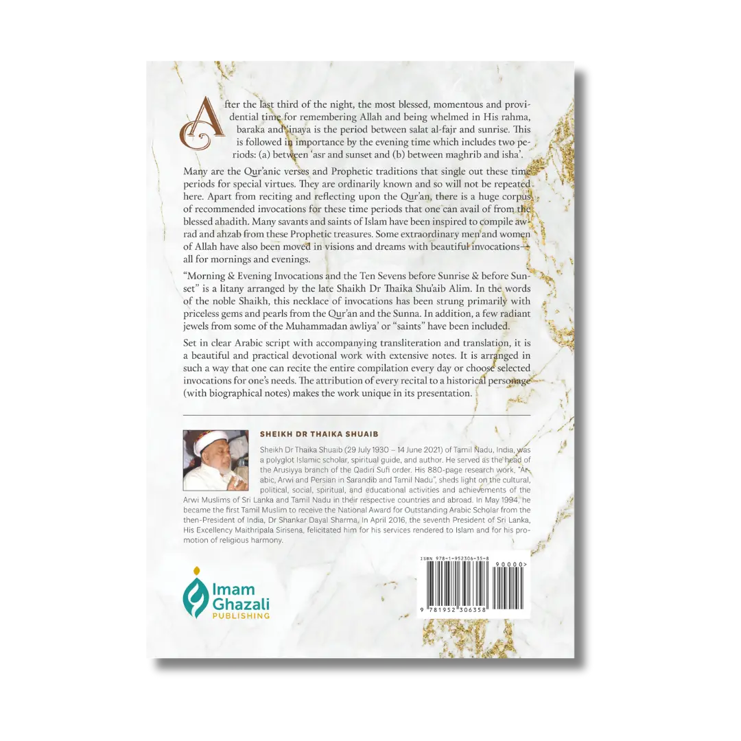 “Morning & Evening Invocations and the Ten Sevens before Sunrise & before Sunset” is a litany arranged by the late Shaikh Dr Thaika Shu’aib Alim. In the words of the noble Shaikh, this necklace of invocations has been strung primarily with priceless gems and pearls from the Qur’an and the Sunna. In addition, a few radiant jewels from some of the Muhammadan awliya’ or “saints” have been included.