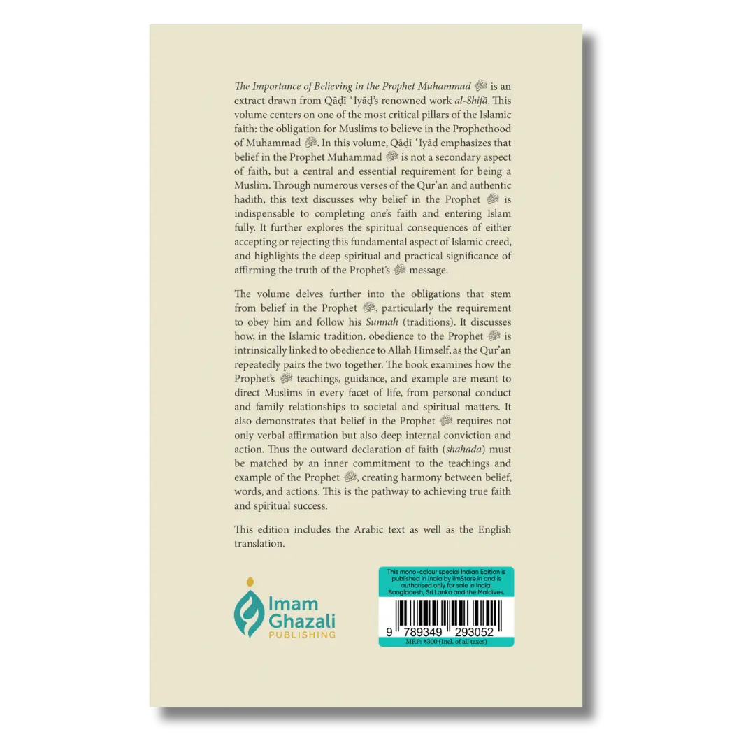 The Importance of Believing in the Prophet Muhammad ﷺ is an extract from Qadi Iyad’s al-Shifa, emphasizing that faith in the Prophet ﷺ is a core pillar of Islam. Through Qur’anic verses and hadith, it explores the necessity of believing in him, obeying his Sunnah, and aligning actions with faith. This volume offers timeless wisdom on the spiritual and practical significance of affirming the Prophet’s ﷺ message.