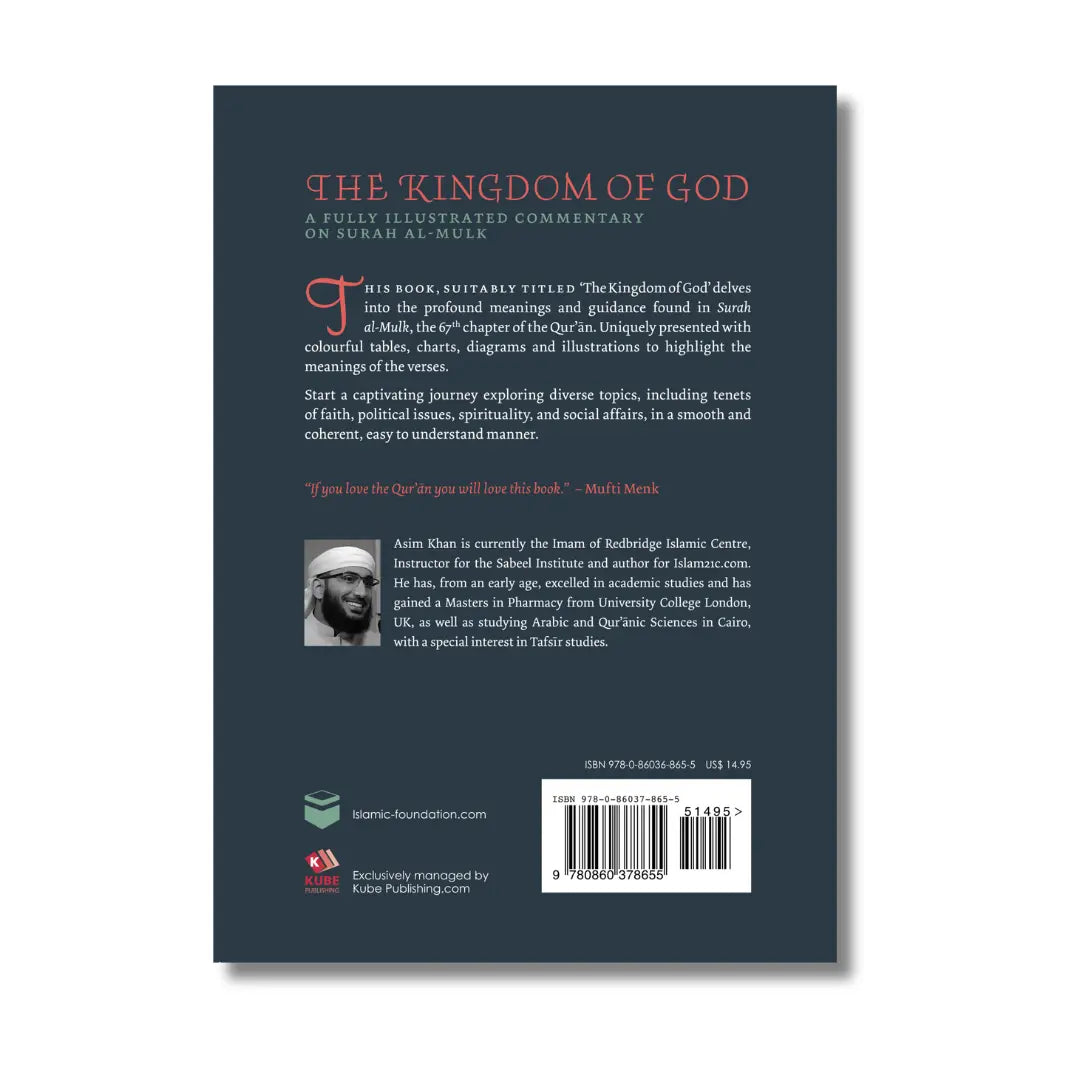 Surah al-Mulk (The Kingdom) invites the reader to look at how the universe moves by God's will, under His perfect control, succinctly captured within its opening verse: Blessed is the One in Whose Hands rests all Kingdom. And He is Most Capable of everything. The Surah (chapter) challenges the reader to formulate a new concept of the universe and its relationship with its Creator as being like that of a kingdom with respect to a king. The reader is sent on a journey to discover a new sense of perspective on the power of God and the extent of His control over the cosmos and beyond. From this new and enlightened viewpoint, the planet and the present worldly life pales into insignificance when placed before the vastness of the seven heavens and the eternity of the Afterlife.